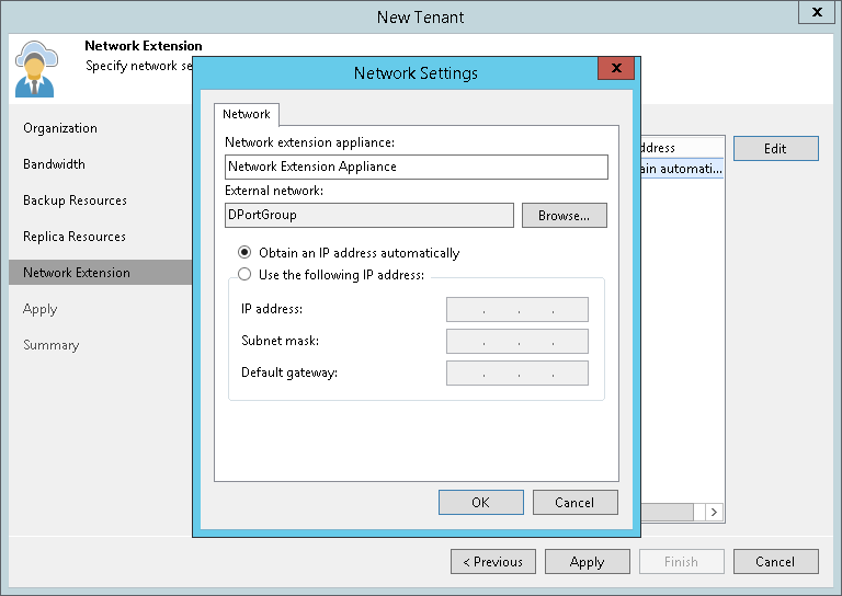 At the Network Extension step of the wizard, the SP configures one network adapter (vNIC) on the network extension appliance. This network adapter connects the network extension appliance to the external network where SP backup infrastructure components reside.