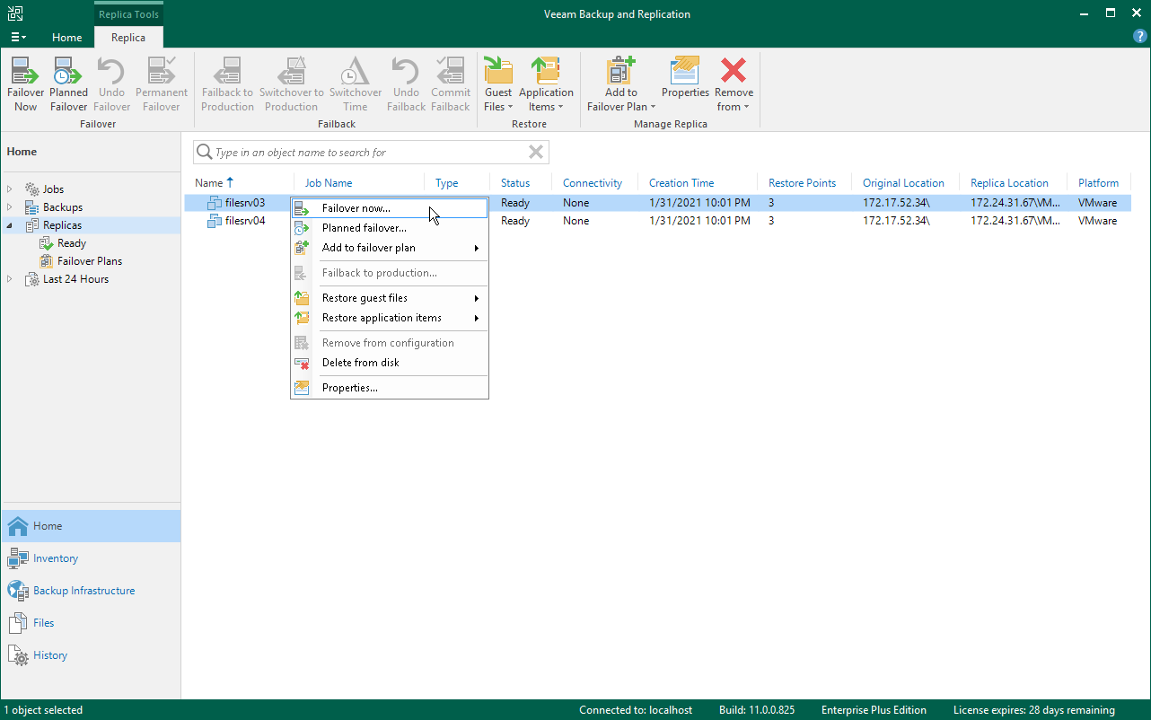 - Open the Home view and select the Replicas node. In the working area, right-click the necessary VM and select Failover now.