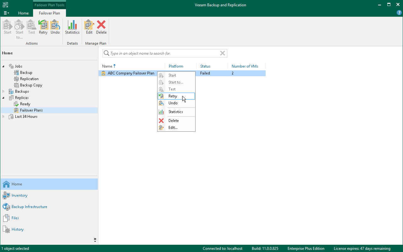 - In the working area, right-click the necessary cloud failover plan and select Retry.