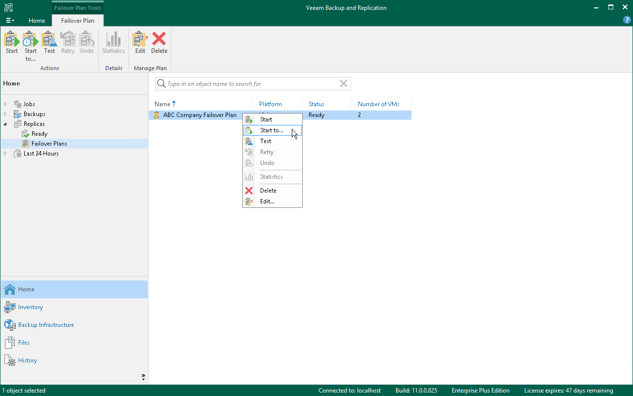 - In the working area, right-click the necessary cloud failover plan and select Start to.