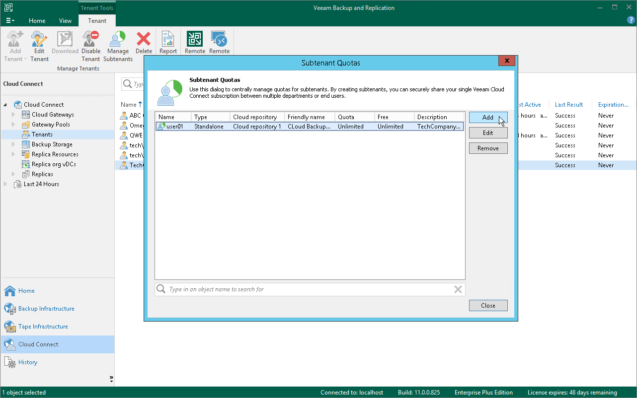 This is an archive version of the document. To get the most up-to-date information, see the current version. Step 1. Launch New Subtenant Wizard To launch the New subtenant wizard:Open the Cloud Connect view.In the inventory pane, click the Tenants node.In the working area, select the necessary tenant and click Manage Subtenants on the ribbon or right-click the tenant and select Manage subtenants.In the Subtenant Quotas window, click Add.