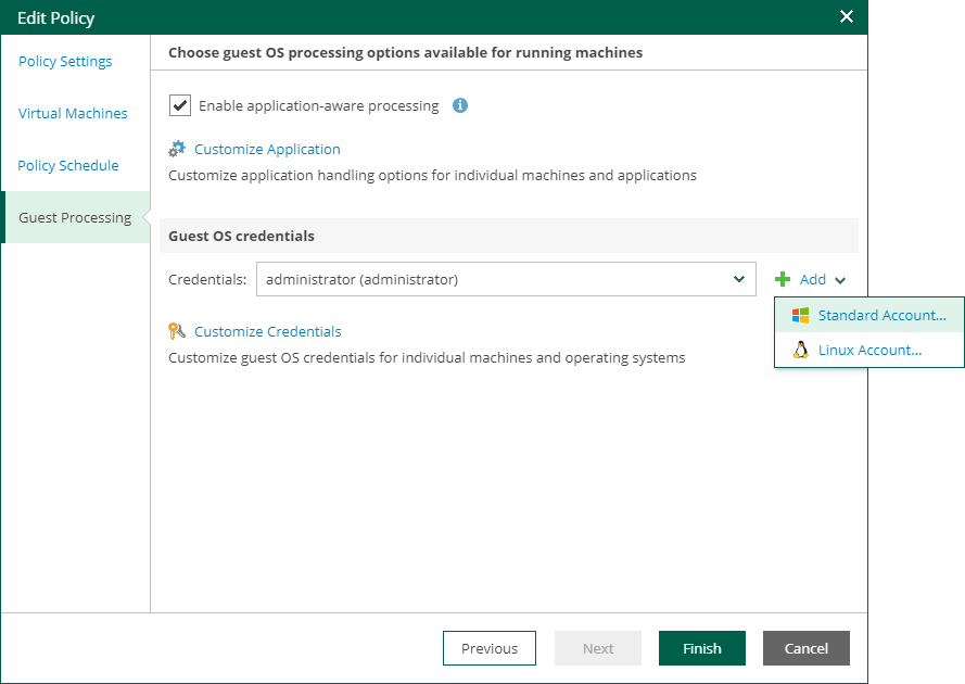 - For Windows guest OS, specify a user account (name and password) with local administrative rights on target machine, and optional description. Credentials must be specified in the following format: