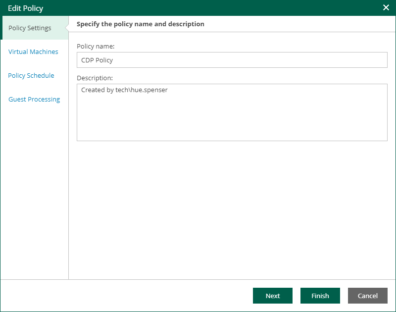 This is an archive version of the document. To get the most up-to-date information, see the current version. Step 2. Edit Policy Name and Description At the Policy Settings step of the wizard, you can modify the name and description of the selected CDP policy:In the Policy name field, specify a name for the policy.In the Description field, provide an optional description for future reference.