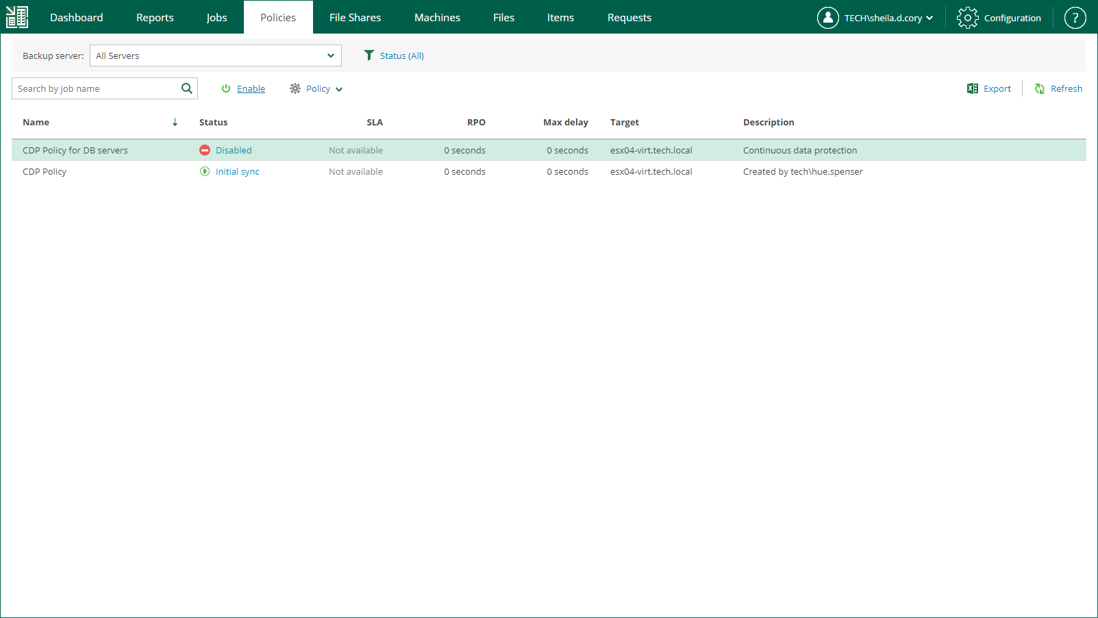 This is an archive version of the document. To get the most up-to-date information, see the current version. Enabling and Disabling Policies Users with the Portal Administrator role can enable and disable CDP policies. Disabled CDP policies are temporary paused.To enable or disable a policy:On the Policies tab, select a policy from the list.On the toolbar, click Enable or Disable.