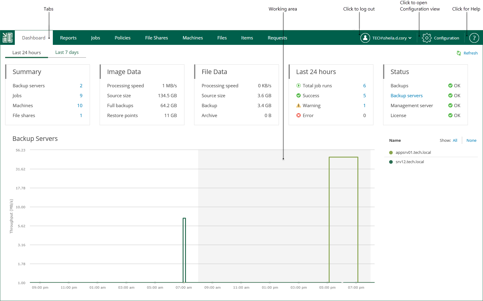 - View on-going statistics for your backup infrastructure using the Dashboard tab. For more information, see Viewing Operation Statistics.
