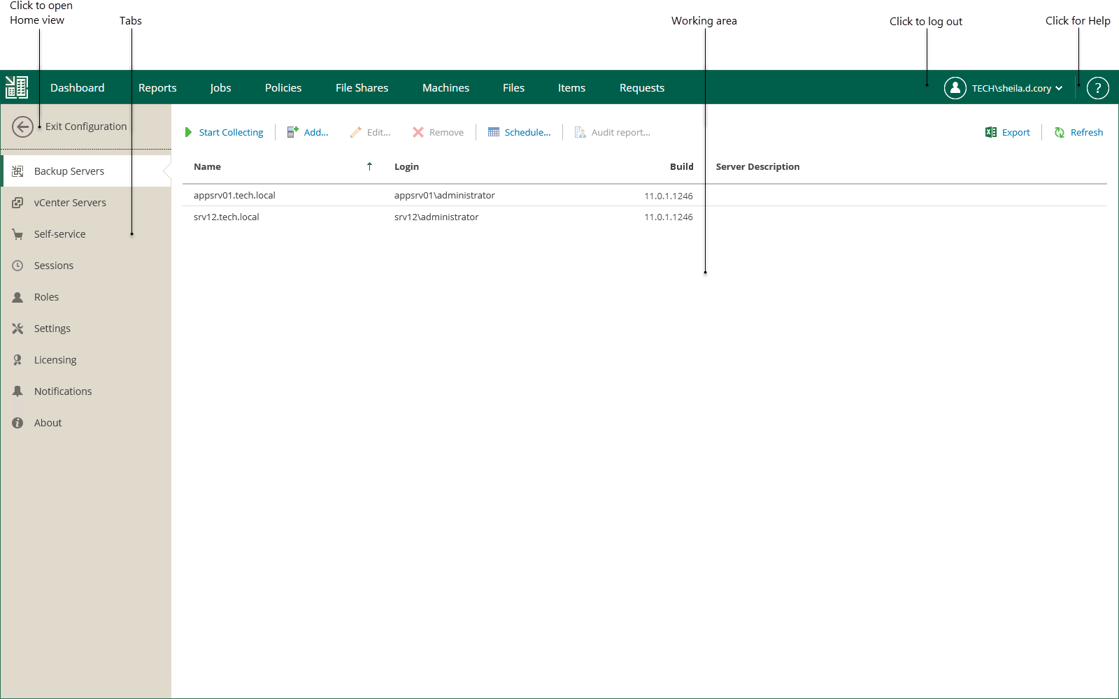 - Add, edit or remove Veeam Backup servers using the Backup Servers tab. For more information, see Managing Backup Servers.