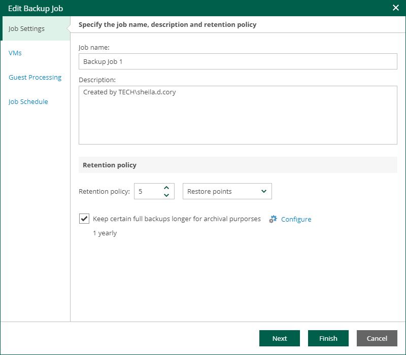 At the Job Settings step of the wizard, you can modify name and description for the selected job, as well as its retention policy.