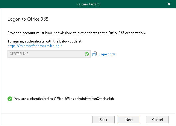 Make sure that the required settings are specified for the Azure AD application used for restore. For more information, see the Required Azure AD Application Settings section of the Veeam Backup for Microsoft Office 365 User Guide.