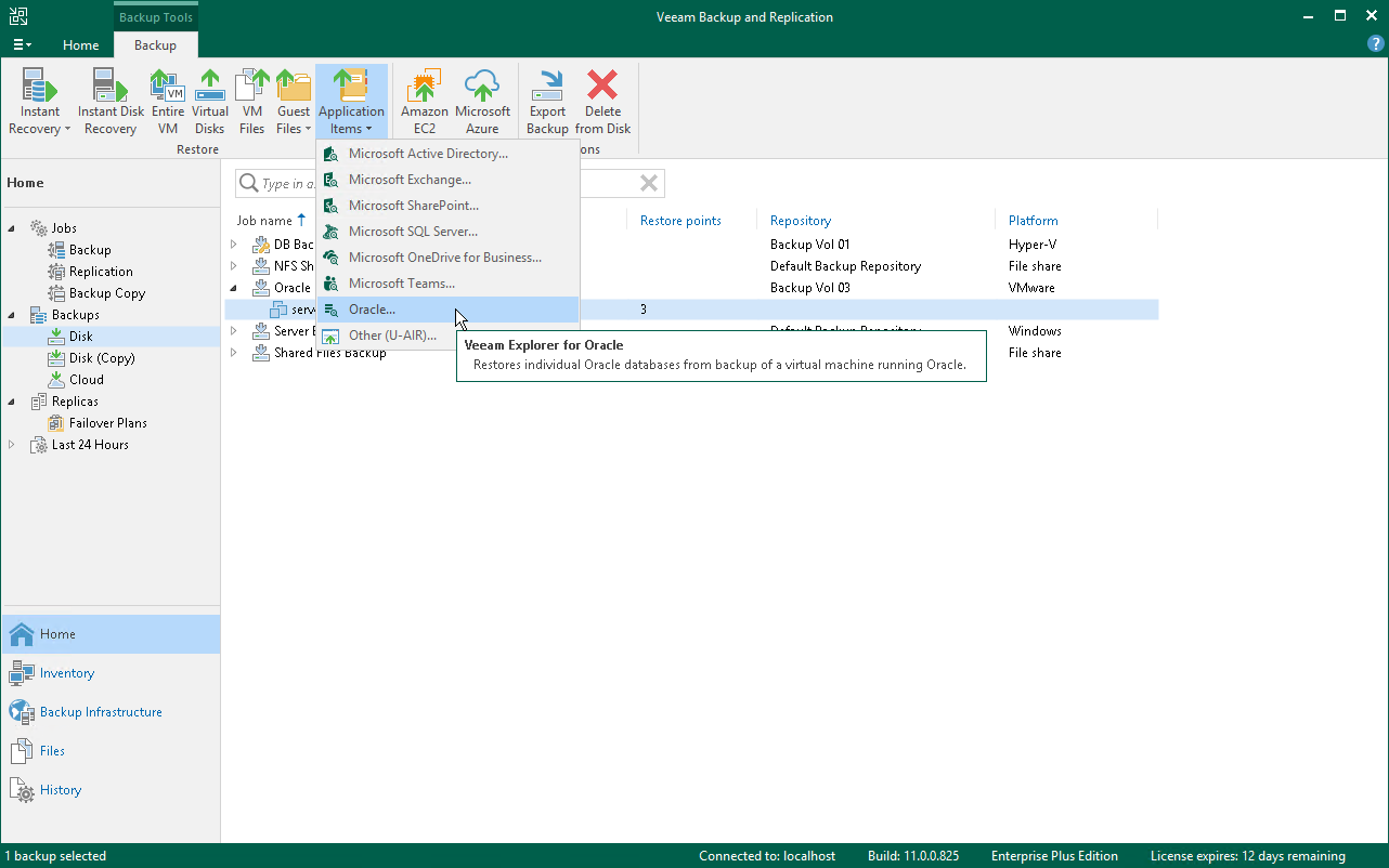 - In the Veeam Backup & Replication console, select the necessary backup and click Application Items > Oracle (or Windows) on the ribbon.