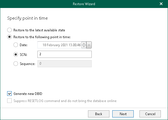 - Select the Suppress RESETLOG command and do not bring the database online check box to skip the OPEN RESETLOGS operation if it was required by the database. The database in this case remains in the mount state.