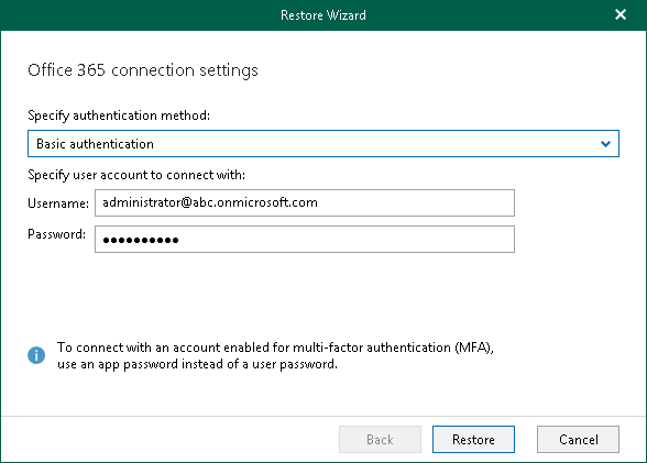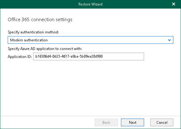 This will allow Veeam Backup for Microsoft Office 365 to use an Azure AD application for a restore. Such an application is used to restore the specified mailbox back to Office 365 organizations with enabled multi-factor authentication (MFA) and enabled or disabled security defaults.