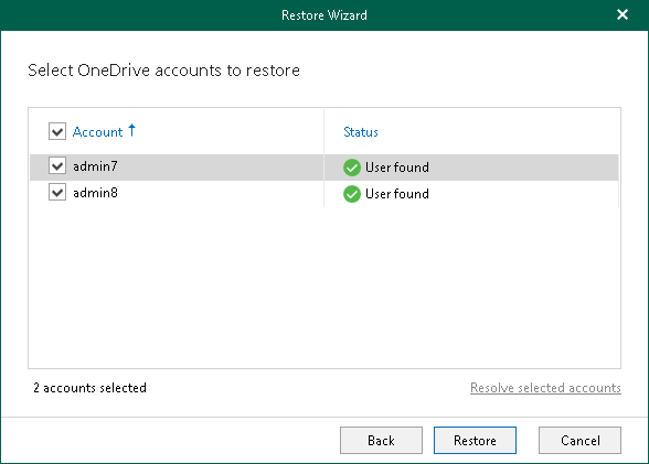 If you want to check whether user accounts whose OneDrives you want to restore exist, click Resolve selected accounts.