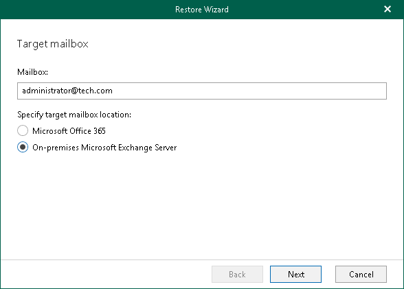 - Select On-premises Microsoft Exchange Server to restore the specified mailbox to an on-premises Microsoft Exchange organization.