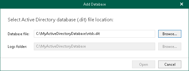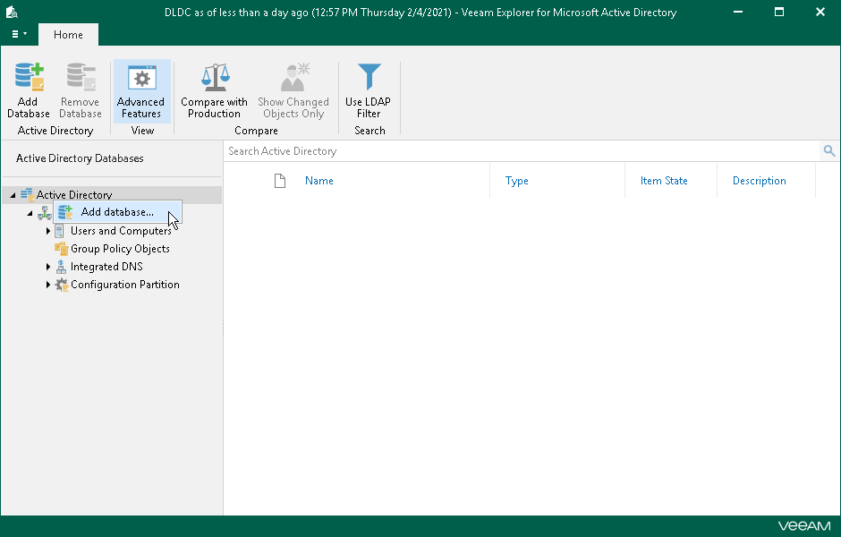 - Select the root Active Directory node in the navigation pane and click Add Database on the toolbar or right-click the Active Directory node and select Add database.