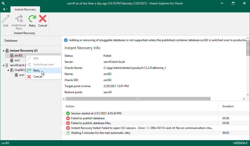 - In the navigation pane, under the Instant Recovery node, select the database.