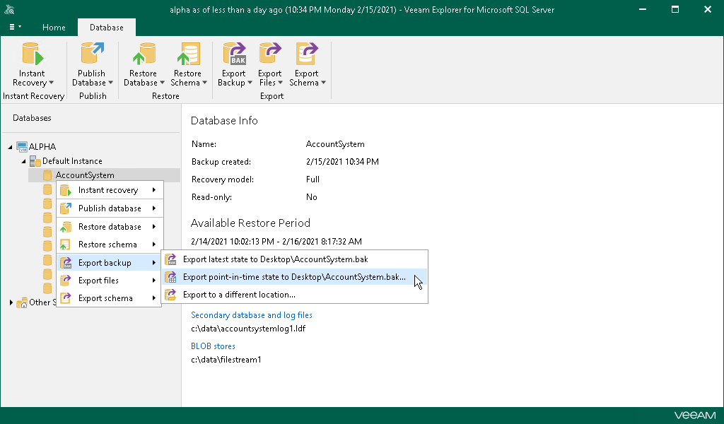 - On the Database (or Server/Instance) tab, select Export Backup > Export point-in-time state to Desktop\<db_name>.bak or right-click a database and select Export backup > Export point-in-time state to Desktop\<db_name>.bak.