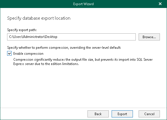 This is an archive version of the document. To get the most up-to-date information, see the current version. Step 3. Specify Database Export Location At this step of the wizard, specify the path to the destination directory.You can select Enable compression check box to reduce the file size. NoteCompression is unavailable if the staging SQL server runs Microsoft SQL Server 2005 or any Express Edition of Microsoft SQL Server.