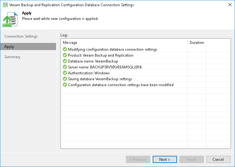Before proceeding, the utility validates the specified settings to make sure that the user account has enough privileges to access the database.