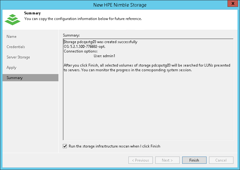 Select the Run the storage infrastructure rescan when I click Finish check box if you want to start the rescan right after you finish working with the wizard. For more information on the rescan process, see Rescan (Storage Discovery) Process.