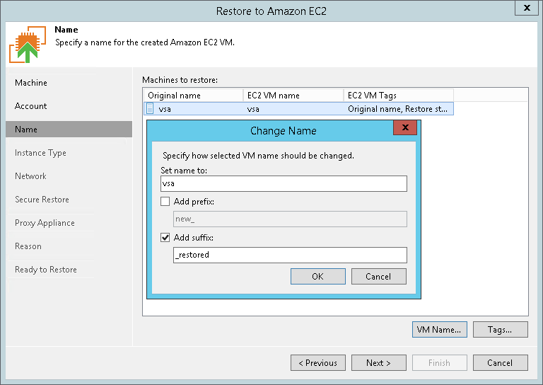 At the Name step of the wizard, you can specify names and manage AWS tags for the restored workloads. By default, Veeam Backup & Replication uses the original workload names and adds the Original name and Restore start time tags.