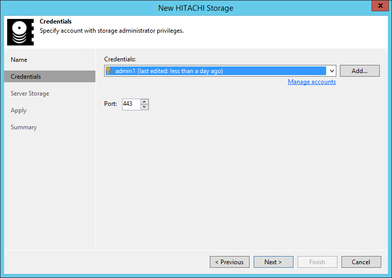 - From the Credentials list, select credentials to connect to the storage system. If you have not set up credentials beforehand, click the Manage accounts link or click Add on the right of the Credentials field to add the credentials. For more information, see Managing Credentials.