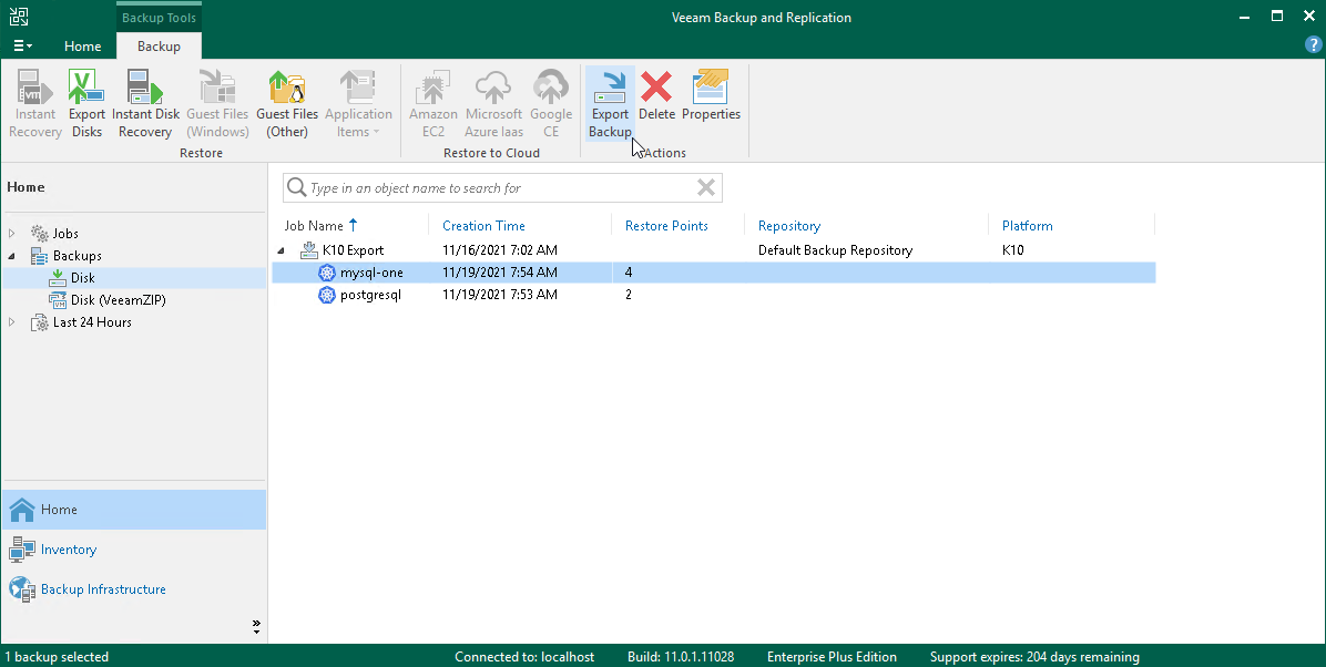 - Launch the Export Backup wizard. To do that, open the Home view. In the inventory pane, navigate to Backups > Disk. In the working area, select applications whose restore points you want to export. On the ribbon, click Export Backup. Alternatively, right-click the application and select Export Backup.