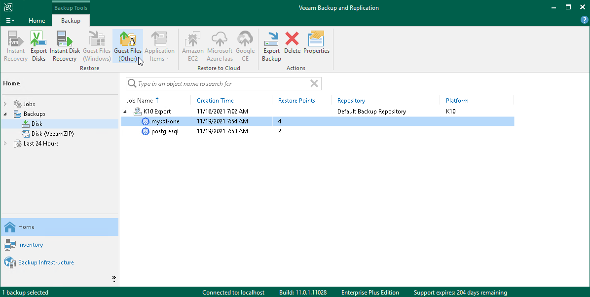- Launch and complete the Guest File Restore wizard. To do that, open the Home view and navigate to Backups > Disk. In the working area, select an application whose files you want to restore. On the ribbon, click Guest Files (Other). Alternatively, right-click the application and select Restore guest files.