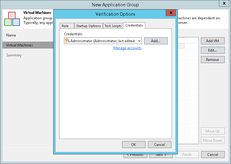 By default, to run the verification script Veeam Backup & Replication uses the account under which the Veeam Backup Service is running. If you need to run the script under some other account, you can specify credentials for this account in the application group settings.