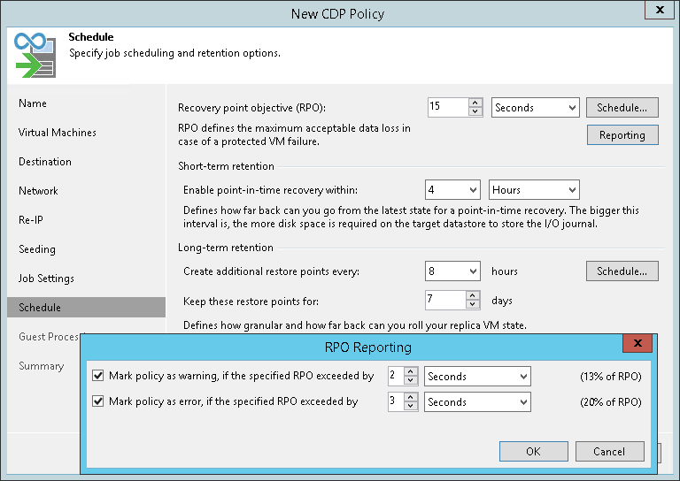 - To instruct the CDP policy to display a warning or error if a newly created restore points are not transferred to the target within the set RPO, click Reporting. Then specify when the policy must display error and warning.