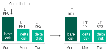 - If an outdated restore point exists, Veeam Backup & Replication rebuilds the file of an outdated long-term restore point (LT RP) to include data of a newer long-term restore point. To do that, Veeam Backup & Replication commits into the base disk file data from the earliest delta disk file that relates to a long-term restore point. This way, the base disk file ‘moves’ forward in the replication chain.
