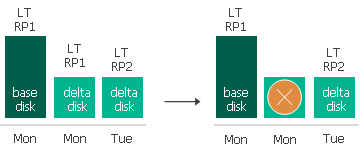 Veeam Backup & Replication retains long-term restore points for the number of days specified in CDP policy settings. When the retention period is exceeded, Veeam Backup & Replication transforms the replication chain in the following way. The example shows how long-term retention works for a VM replica with one virtual disk.