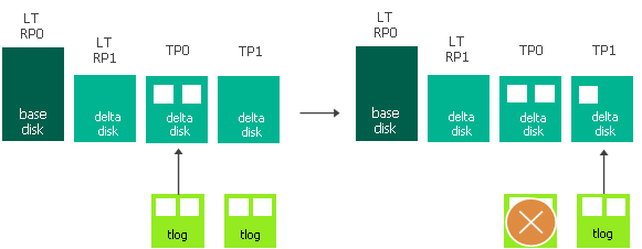 - If the transaction log file does not contain data for further short-term restore points, Veeam Backup & Replication deletes the transaction log file as redundant — its data has already been committed into the technical delta disk file.
