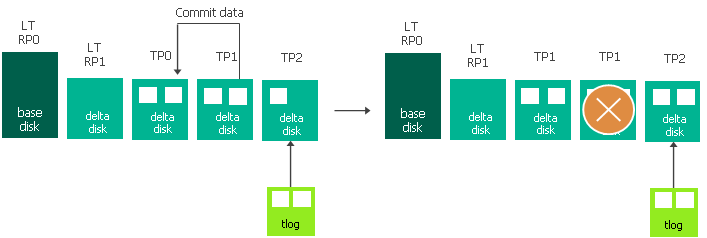 - Veeam Backup & Replication removes the earliest delta disk file from the chain as redundant — this data has already been committed into the base disk file.