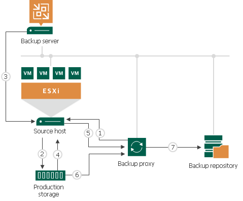 - The VMware backup proxy uses metadata to copy VM data blocks directly from the source storage over the SAN.