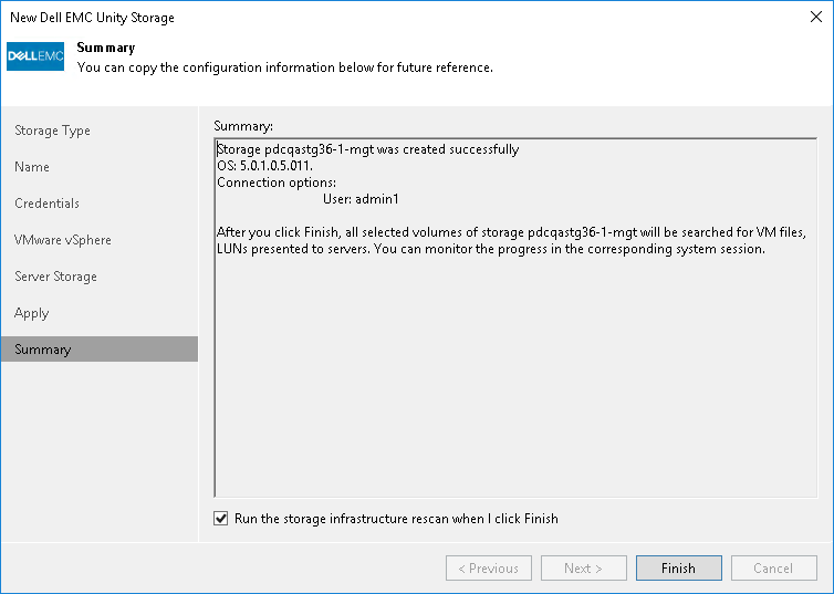 Select the Run the storage infrastructure rescan when I click Finish check box if you want to start the rescan right after you finish working with the wizard. For more information on the rescan process, see Rescan (Storage Discovery) Process.