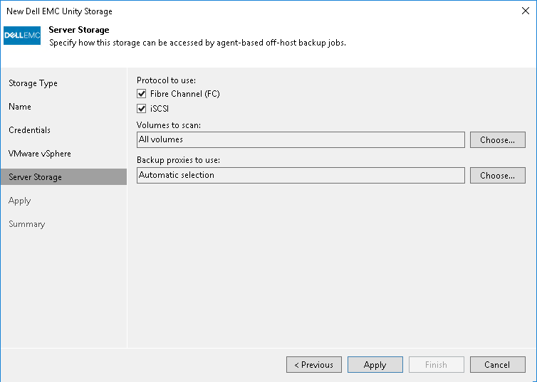 - To rescan storage systems and perform Backup from Storage Snapshots, you need to configure a backup proxy. On the right of the Backup proxies to use field, click Choose and define backup proxies that you want to use for these operations.
