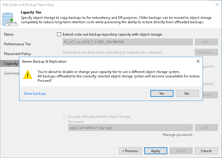 Consider that after you exclude an object storage repository that is being used as a capacity extent and is storing offloaded backup data, Veeam Backup & Replication automatically puts the excluded object storage repository into the maintenance mode. Once a repository is in the maintenance mode, you will not be able to restore your data from it. To switch back to normal, you will have to re-add that repository as a capacity extent and synchronize existing backup chains with your performance extents. After the synchronization is complete, the existing backups will become available as Imported. For more information, see Synchronizing Capacity Tier Data.