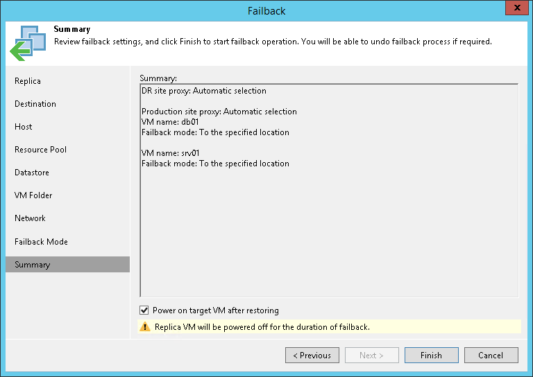 At the Summary step of the wizard, review the configured failback settings and click Finish.