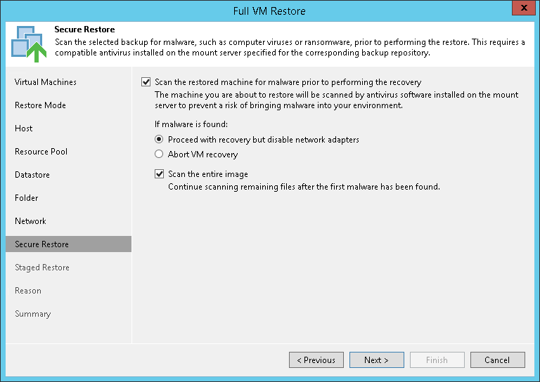 You can instruct Veeam Backup & Replication to perform secure restore — scan machine data with antivirus software before restoring the machine to the production environment. For more information on secure restore, see Secure Restore.