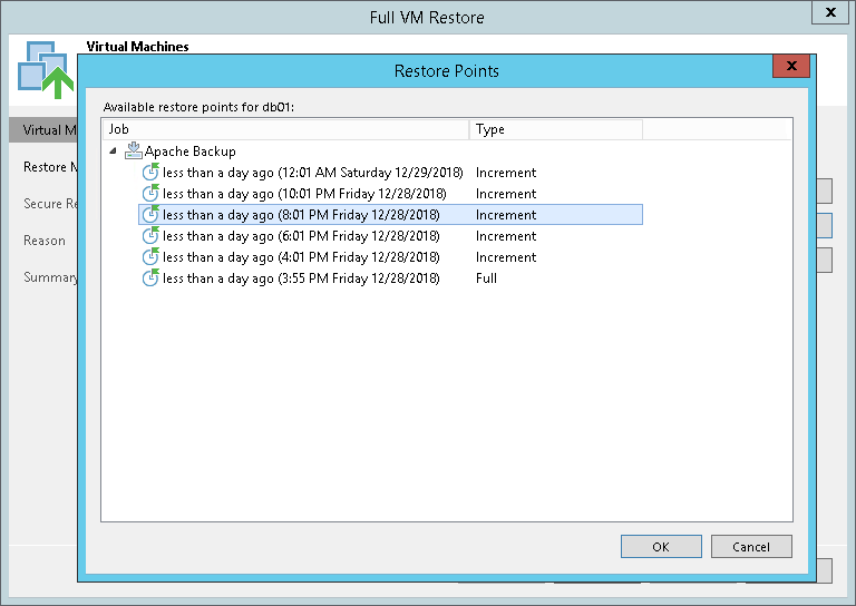 - In the Restore Points window, select a restore point from which you want to restore the VM.