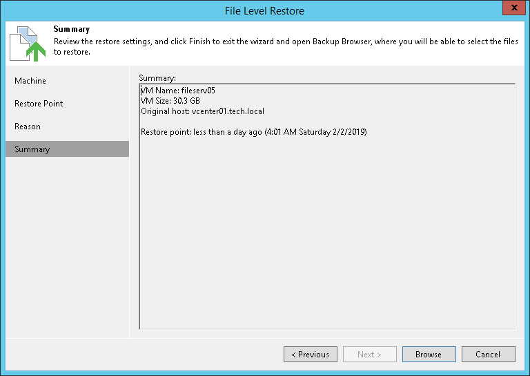 This is an archive version of the document. To get the most up-to-date information, see the current version. Step 6. Verify Restore Settings At the Summary step of the wizard, check details of the restore task and click Browse to close the wizard and open the Veeam Backup browser.