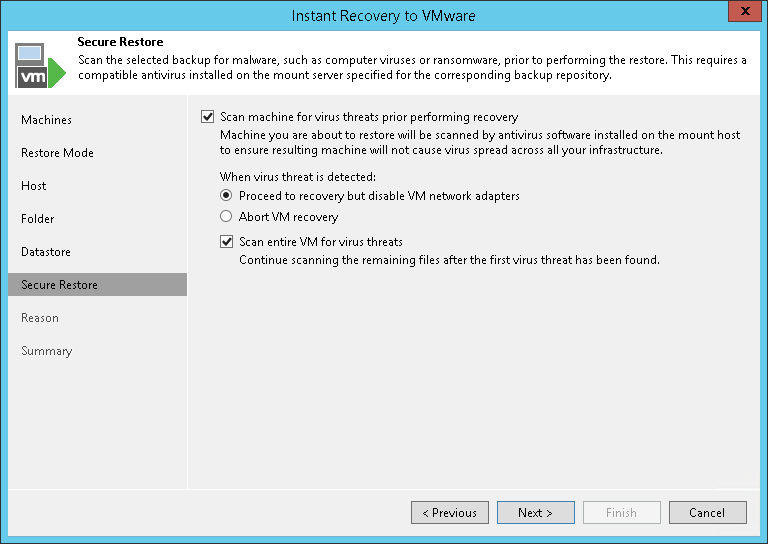 - At the Secure Restore step of the wizard, select the Scan machine for virus threats prior performing recovery check box.