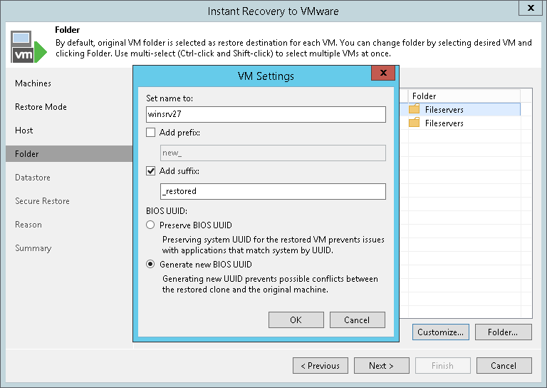 For each recovered VM, you can change a VM name, BIOS UUID and folder where VM files must be stored. It is recommended that you specify a new name and generate a new BIOS UUID to prevent conflicts if the original workload still resides in the production environment. The name and BIOS UUID change is not required if the original workload no longer exists, for example, it was permanently deleted.