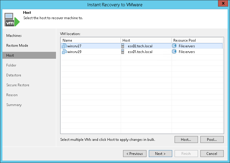 At the Host step of the wizard, specify a target host and resource pool for recovered VMs: