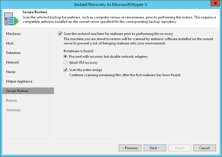 You can instruct Veeam Backup & Replication to perform secure restore — scan VM data with antivirus software before restoring the VM to the production environment. For more information on secure restore, see Secure Restore.
