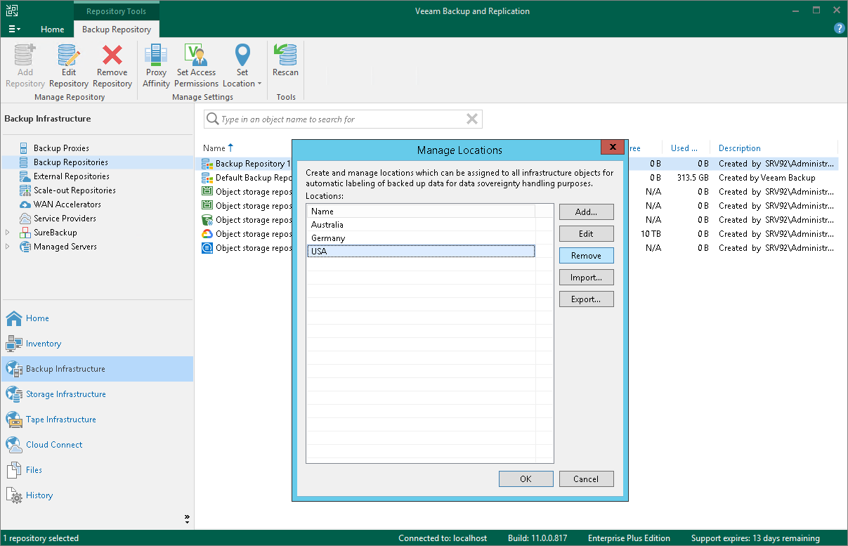 - In the Manage Locations window, select the location and click Delete. If the location is currently assigned to some infrastructure objects, Veeam Backup & Replication will display a warning with the list of objects that belong to this location. Click Yes to confirm the location deletion.
