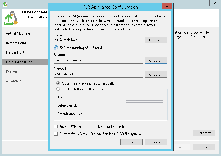 When choosing an ESXi host for the helper appliance used for file-level restore from the Novell Storage Services file system, make sure that it allows running VMs with 64-bit guest OSes. |