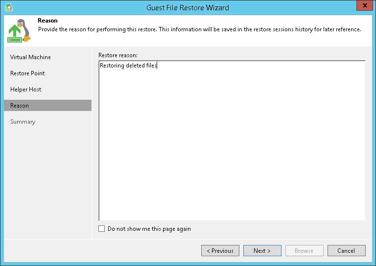 At the Reason step of the wizard, enter a reason for restoring VM guest OS files. The information you provide will be saved in the session history and you can reference it later.