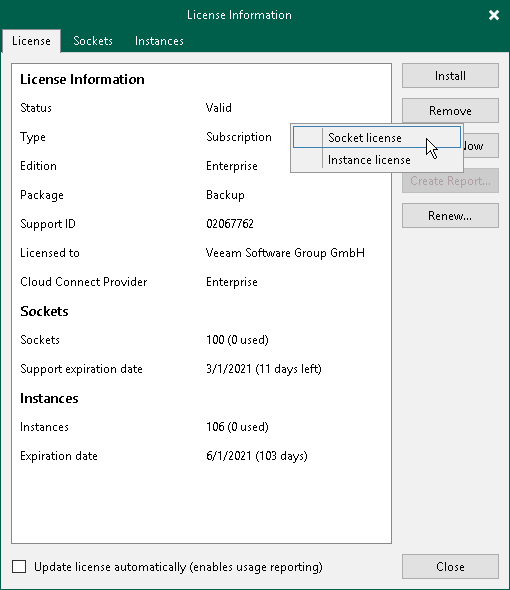 You can also remove a part of merged license. If you do so, Veeam Backup & Replication will operate under the other part of the merged license. For more information, see Merging Licenses.