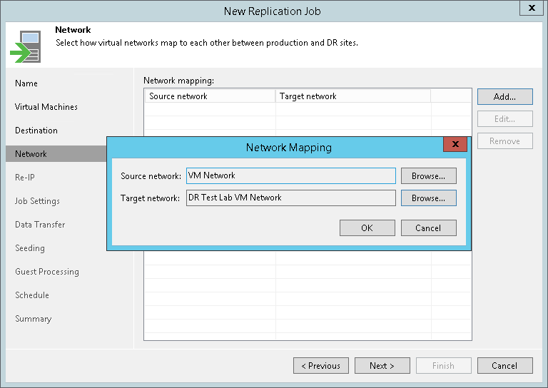 At the Network step of the wizard, configure a network mapping table. This table maps networks in the production site to networks in the disaster recovery (DR) site. When the job starts, Veeam Backup & Replication will check the network mapping table. Then Veeam Backup & Replication will update replica configuration files to replace the production networks with the specified networks in the DR site. As a result, you will not have to re-configure network settings manually.